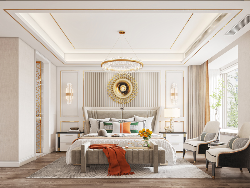金色装饰画与线条提升奢雅感,柔软的床品和舒适的座椅,满足休憩与放松需求,尽显精致舒适。
