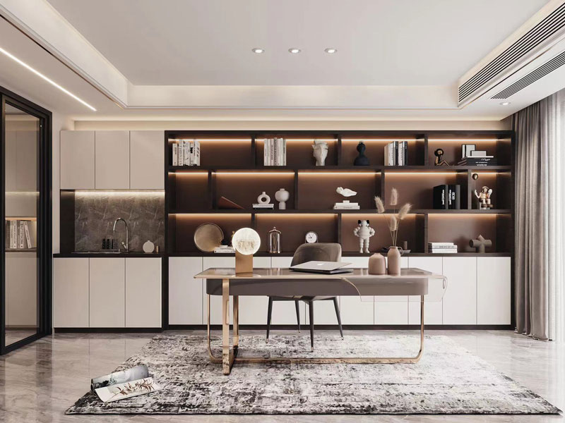 中性色调沉稳大气,金属元素点缀,精致和谐,开放式书架搭配灯带,呈现氛围且具质感的工作学习空间。