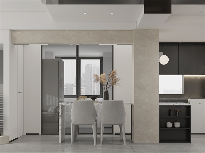 餐区色调搭配明朗清爽,大理石餐桌搭配简约餐椅,以及浅米色墙面,简洁沉稳,装饰摆件增添生机。