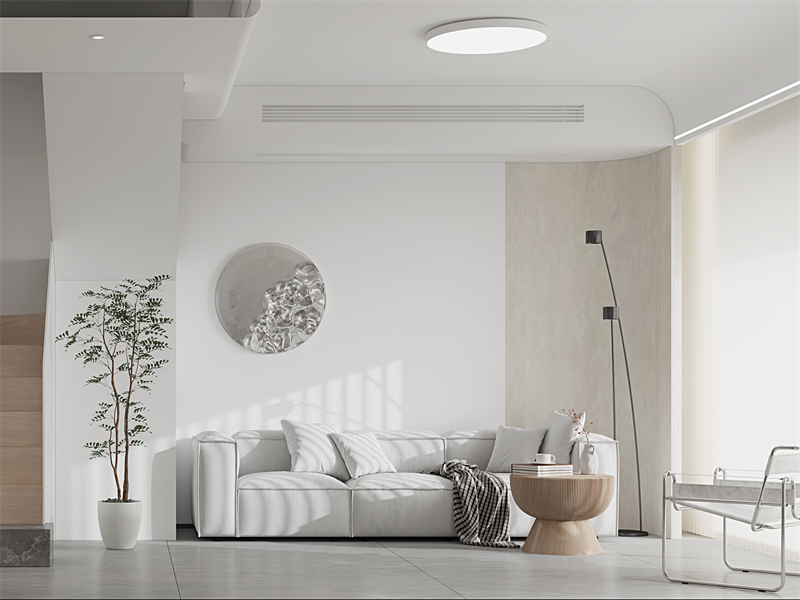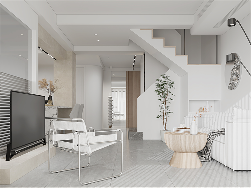 色彩以纯净的白色和浅木色为主,搭配灰色地砖,营造明亮清爽的客厅区域,艺术感的装饰与绿植点缀,自然时尚。
