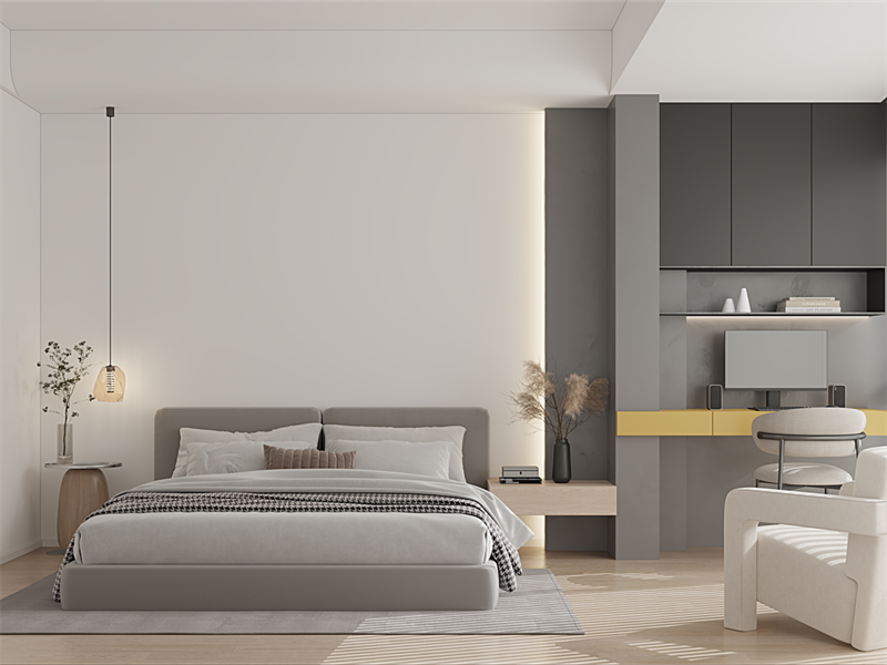 卧室色彩运用上,以灰色和米白色为主,营造出柔和宁静,定制书桌设计满足日常办公需求,提升实用性。