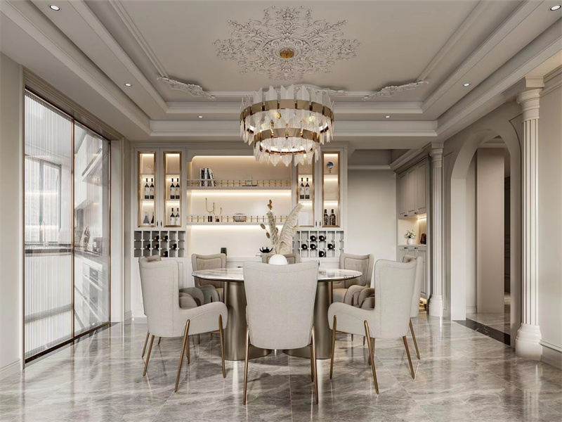 餐厅区域宽敞明亮,酒柜实用且美观,适合亲友聚餐,体现品位,色彩以米白为主,搭配金色与雕花元素,温馨又不失精致。