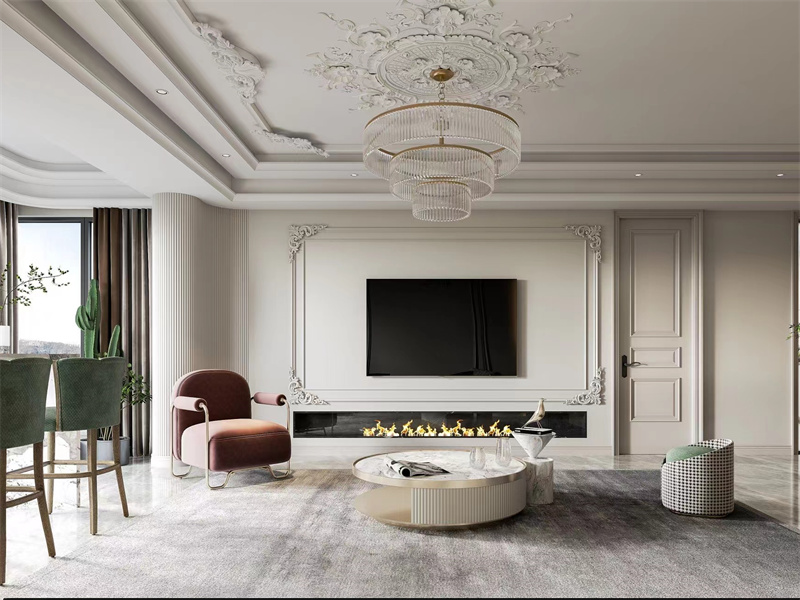 电视墙雕花精致,下方壁炉设计,为空间增添融融暖意,布局开阔大气,整体既有复古韵味又不失现代舒适感。