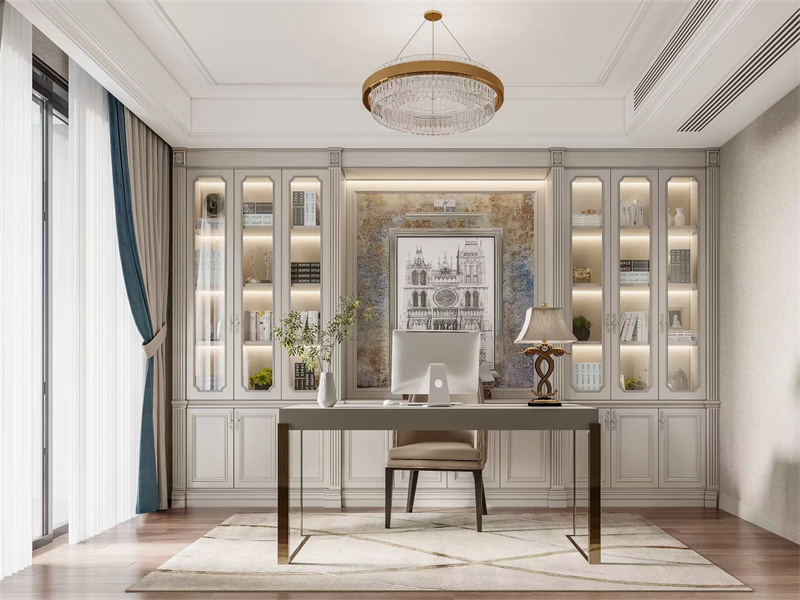 色彩以浅灰、白为主,柔和又不失格调,整面收纳柜设计满足日常储物需求,水晶吊灯、精致摆件尽显优雅。
