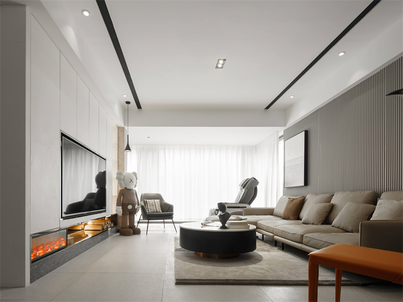 浅调沙发搭配异形茶几,金属细节提升精致感。定制柜体整合电视墙与收纳功能,嵌入式壁炉元素增添氛围,艺术摆件与肌理墙面丰富视觉层次。