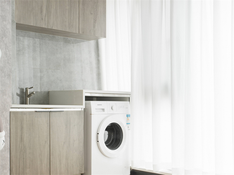 木肌理柜体与浅灰墙面形成材质呼应,整合洗衣与洗手功能,白色家电与浅调基底统一,弱化设备的厚重感,窗边布局保障采光,让洗衣场景柔和整洁。