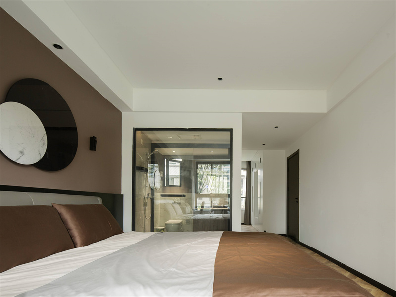 床品采用棕白撞色,柔化空间质感,背景墙分色设计搭配圆形艺术镜,强化视觉层次。玻璃隔断连通卫浴区,保障采光通透,营造出静谧且具格调的休憩氛围。