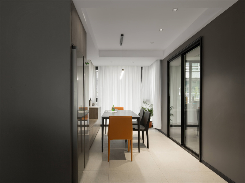 深灰柜体与浅白地面形成明暗对比,黑色餐桌搭配橙色餐椅,以亮色柔化深调的冷硬,玻璃移门保障空间通透,与外部区域自然衔接,线性吊灯简洁利落。