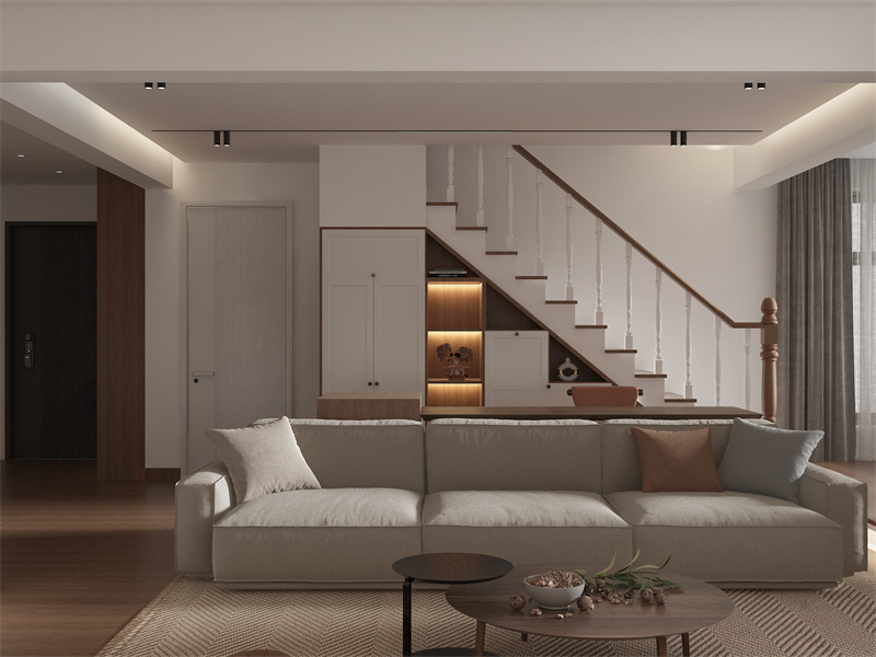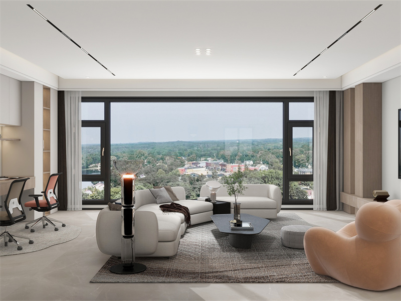 米棕主调,办公区与休闲区融合,收纳柜“藏露结合”。工作时,精致桌椅满足效率办公;休闲时,舒适沙发适配放松,灵活布局适配多元生活场景,传递雅致质感。