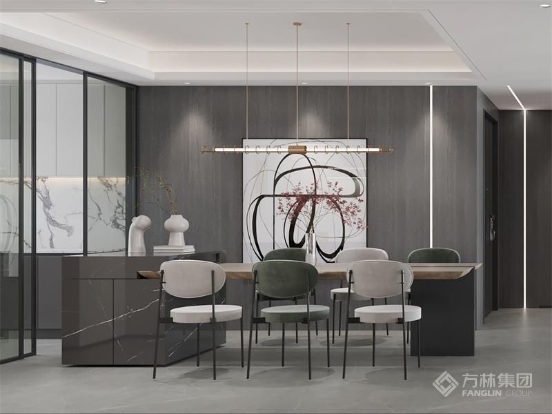 在餐厅和客厅之间的墙面做一个景点,用清玻璃分四层布置,玻璃板的最上方设置冷光射灯直通每层玻璃层板,玻璃板上放置些工艺美术品,异常耀眼夺目。