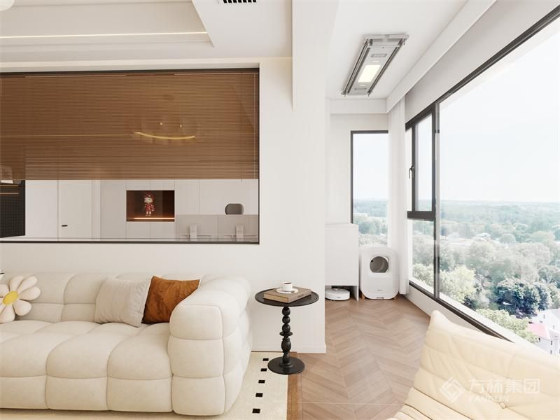 以奶油色为基调奠定温柔氛围,融入胡桃木、毛绒布料等元素,通过合理的功能规划,搭配绿植,结合望江景观,打造兼具放松感与现代舒适感的居住空间
