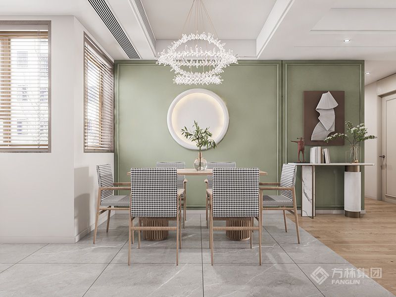 餐厅上方简约的流线形灯,灯光的明暗变化,增加层次感,更自由随性。胡桃木色墙板上面白色的艺术挂画营造出了空间的视觉冲击力,烘托出氛围感。