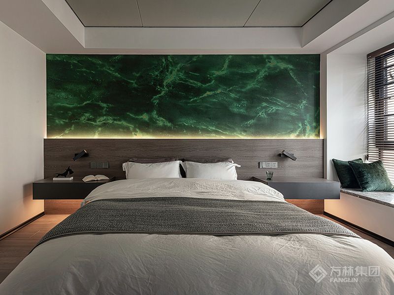 采用了皮艺、高级布料搭配木饰面、亚克力,产生一种材质的碰撞,一抹嫩绿色给空间带来一丝明快与活力。