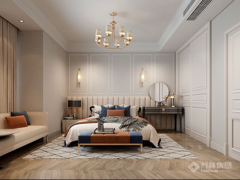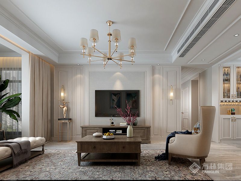 本案采用简约美式的装修手法,整个格局动态流畅,简约的色调与精致的软装摆件构成了这个空间的温暖与品质。