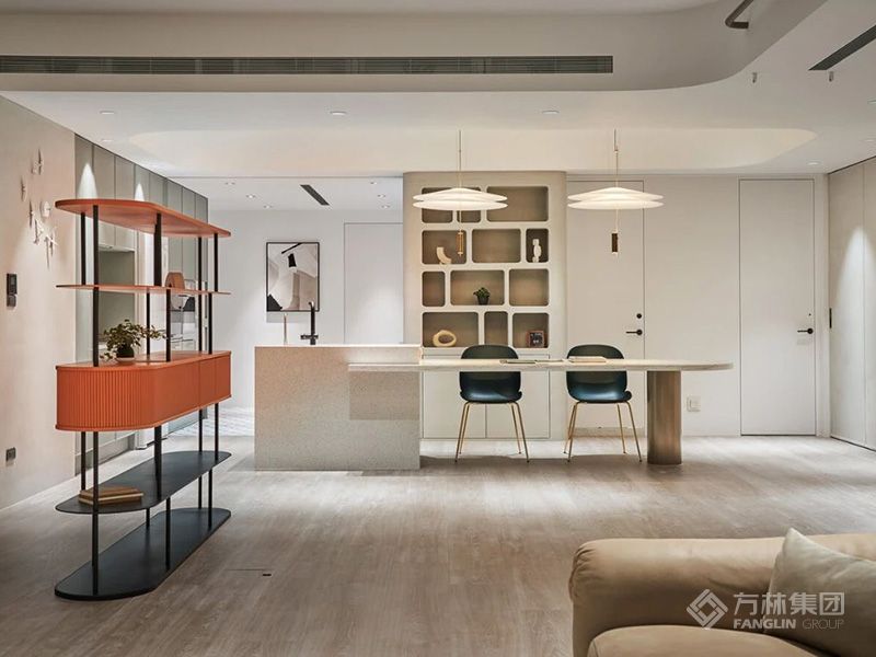 屋主喜爱北欧明亮的氛围和开阔视野,因此将客厅、餐厅、厨房集结为一个宽敞且穿透的活动场域,配置了一张牛奶糖色的Emerald 皮沙发,可电动升降的头枕克服了过往高椅背的笨重感。