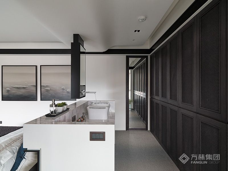 电视背景墙采纯黑色大理石,弱化电视背景效果,增加整体效果,分离电视的设计。